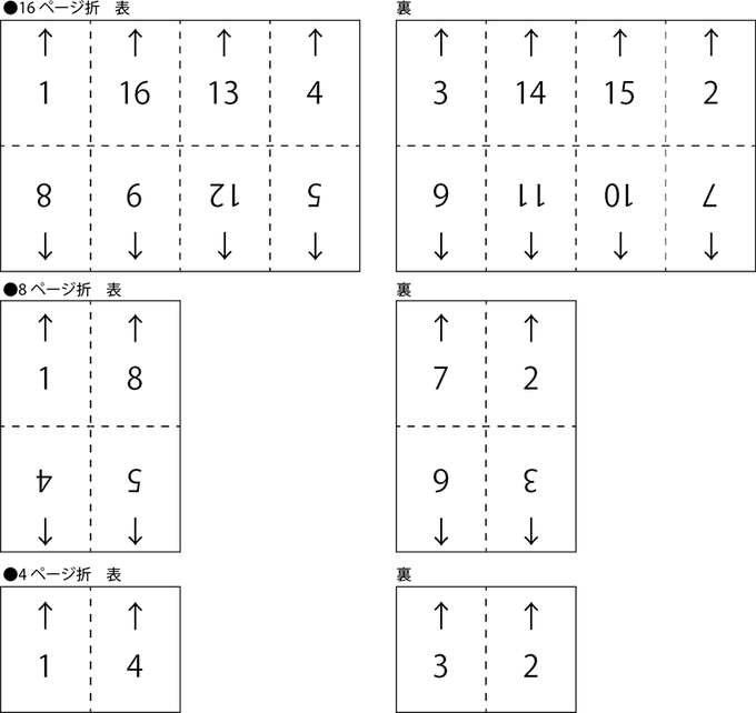 以下に示すのが代表的な面付様式(右開きの場合)となります。図の中の矢印はページの向き