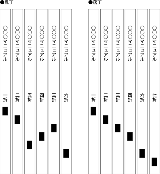 この折の順番がおかしくなることを「乱丁」、順番になっておらず折が抜けていることを「落丁」といいます。いずれの場合でも、本の体裁としては間違ったものとなります。