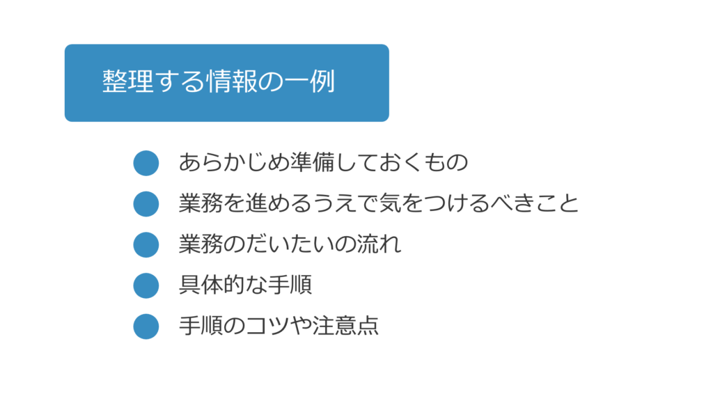 上記の他にも、業務で使う特殊な道具などがあれば調べて情報をまとめておくなど、業務に応じて必要な情報を見定めていくようにしましょう。