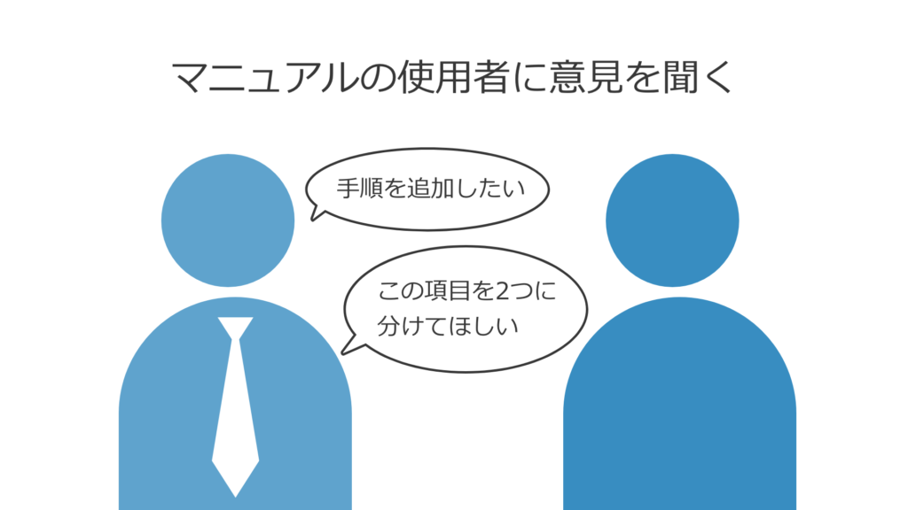 現場できちんとマニュアルが使われているか、実際使ってみてわかりづらいところややりにくいところはないか、などの意見の吸い上げをしましょう。