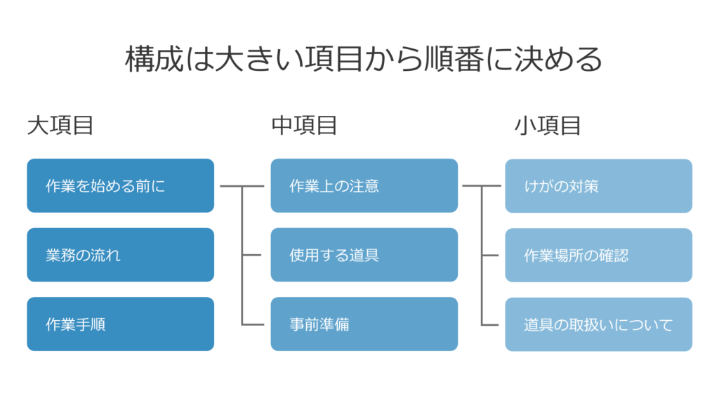 大きい項目から並べることでマニュアル全体の流れをイメージしやすく、中項目や小項目の順番や内容を考えるのが楽になります。