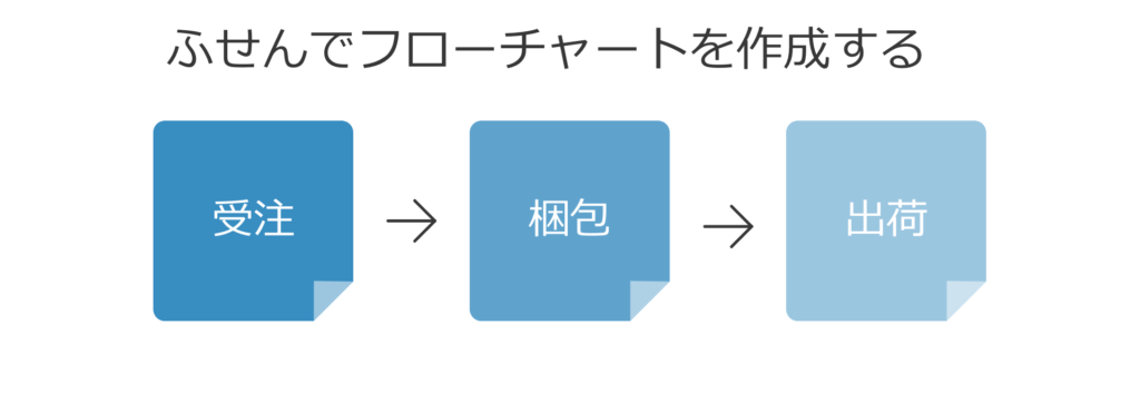 フローチャートを作るときはまずおおまかに業務の手順をメモに書き出してから図を組み立てます。このときふせんを使い、ふせん1枚につき1手順を書き込んで並べるようにすると簡単に下書きができますよ。