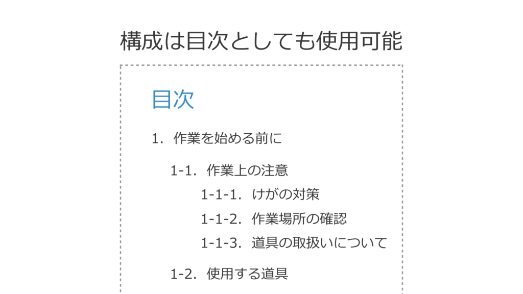 しっかり作った構成はそのままマニュアルの目次にも流用が利きますよ。