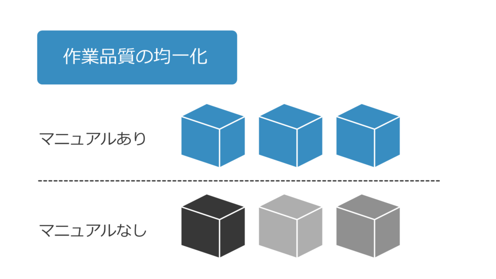 実際に業務を行うとき、マニュアルで共有されたとおりの手順やノウハウに従うようにすることで、作業時期や作業者の経験値に作業結果が影響されることを防げます。