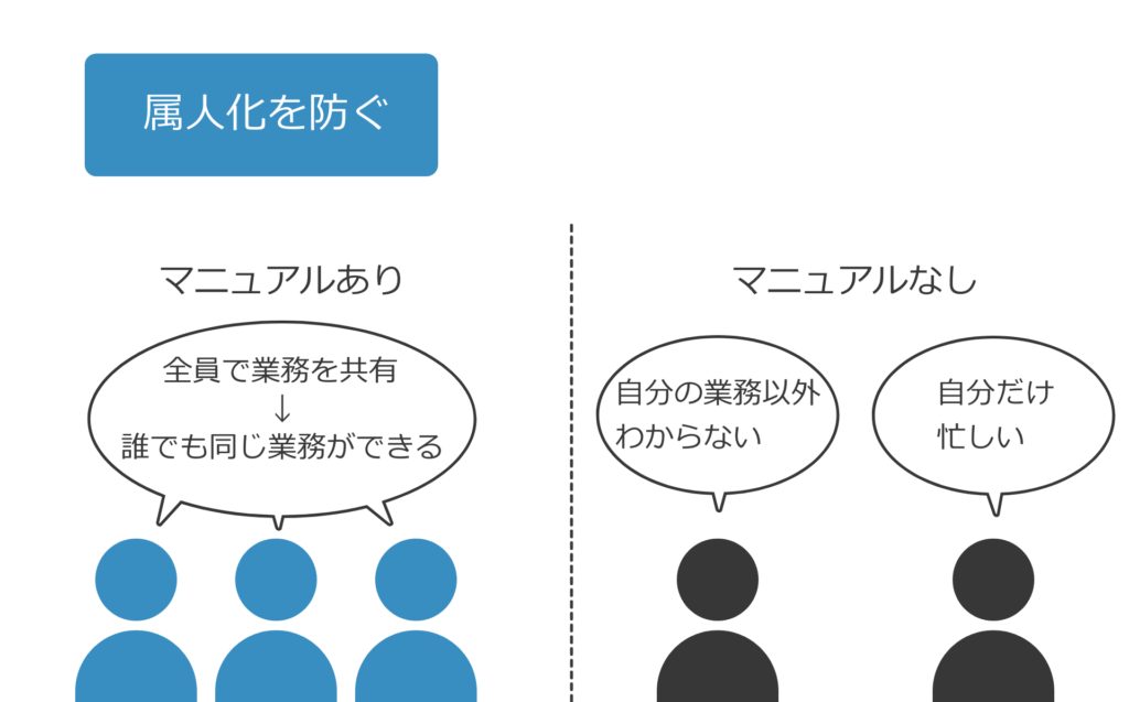 マニュアルによる手順やノウハウの共有によって、作業者に影響されずに成果を得られるようになるということは、業務を特定1人の能力や経験に頼りきりになる状況を防ぐことにもつながります。