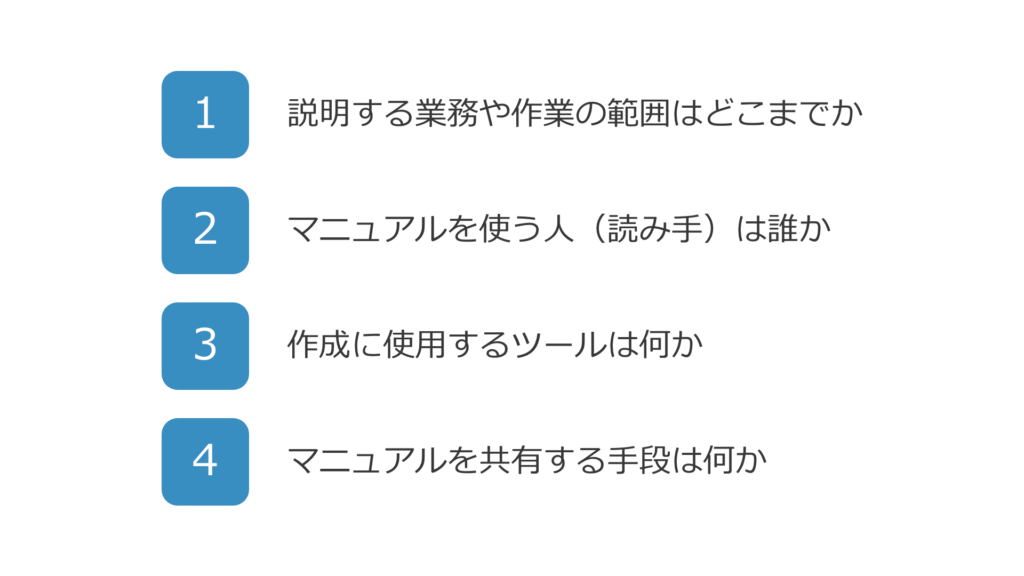 「何について」「誰に」「何で作って」「どうやって見てもらう」この4点がハッキリしていないと目的が曖昧になってしまい、情報の整理やマニュアルの構成を考えるときにうまくまとまらなくなってしまいます。