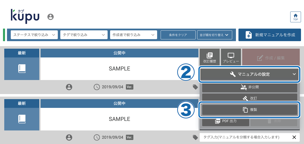 ②複製したいマニュアルの「マニュアルの設定」をクリックします。