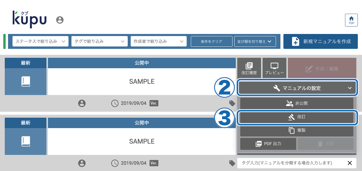 公開したマニュアルを編集したい場合は「改訂」を行ってください。