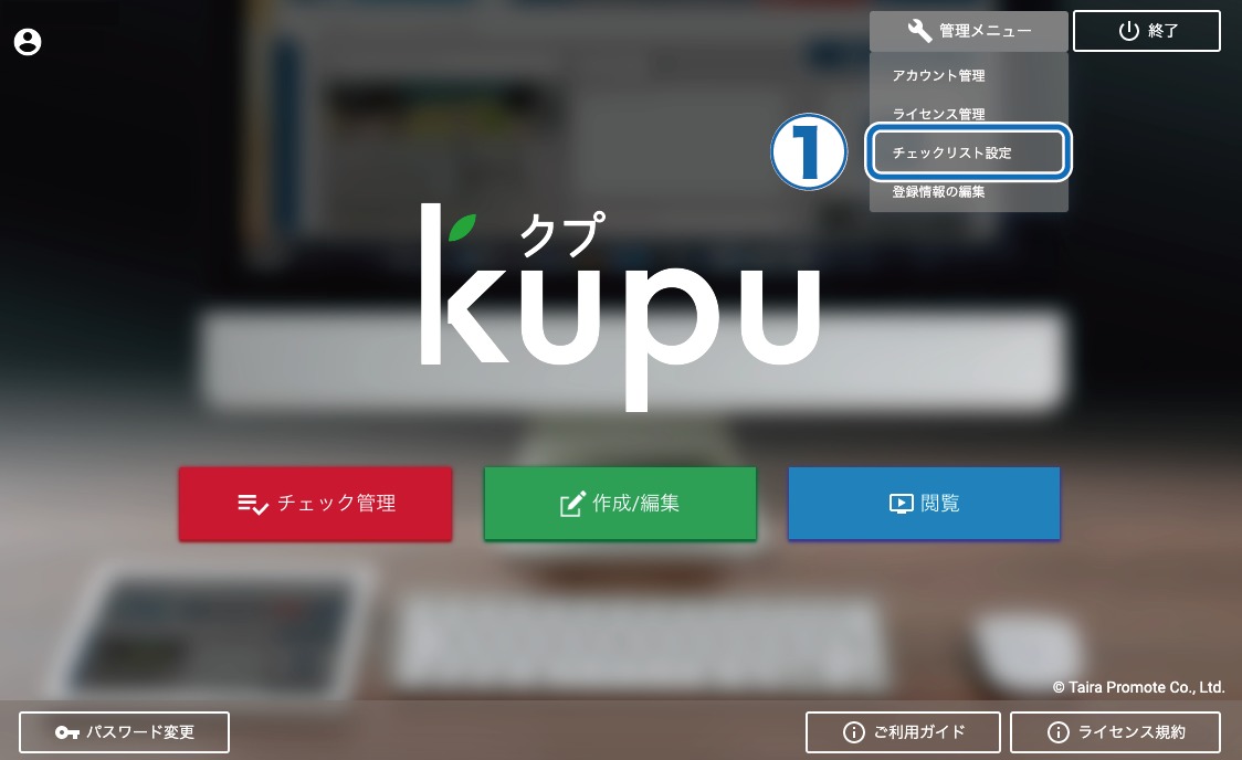 ①トップページ右上の「管理メニュー」から「チェックリスト設定」を選択します。