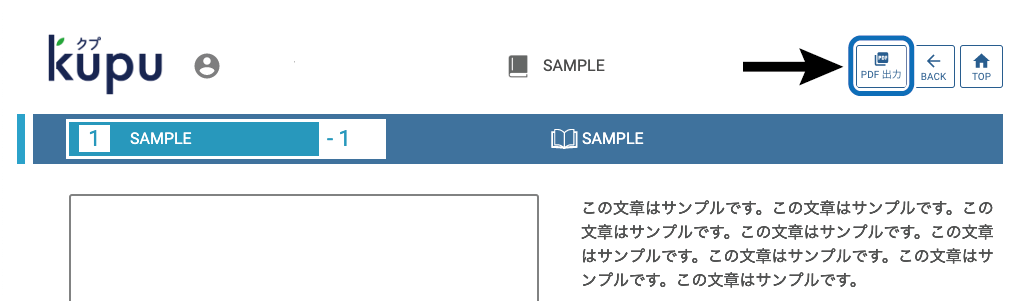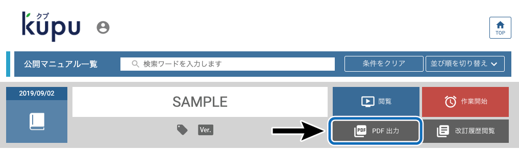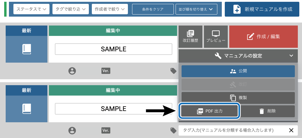 | 作成したマニュアル | ◆ 作成 / 編集モードからPDF出力 ①トップページから「作成 / 編集」を選択します。 ②「マニュアルの設定」をクリックします。 ③「PDF出力」を選択します。 ![]() ◆ 閲覧モードからPDF出力 ①トップページから「閲覧」を選択します。 ②「PDF出力」を選択します。 ![]() ◆ ページをまとめて表示した状態でPDF出力 ①トップページから「閲覧」を選択します。 ②出力したいマニュアルの「閲覧」をクリックします。 ③右上の「ページをまとめて表示」をクリックします。 ④「PDF出力」を選択します。 ![]() |