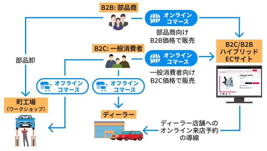 - 部品商向けにはTier別の価格設定を可能にする機能を構築し、業務の効率化と取引の利便性を向上。 また、D2Cチャネルを新たに構築し、消費者がオンラインでパーツやアクセサリを購入できる環境を提供。 これにより、購入体験を最適化するとともに、ディーラー店舗への来店予約や配送・支払いオプションを連携させ、シームレスな購買体験を実現した